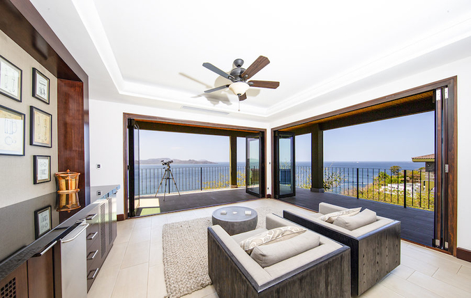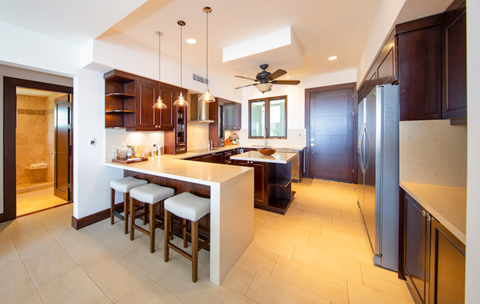 The main living area flows effortlessly from kitchen, to dining room to sunlit living room, making this residence an entertainer's delight. The fully-equipped kitchen features a massive side by side fridge/freezer, stacked ovens and a breakfast bar. The space is open, functional and perfect for hosting events. The kitchen flows seamlessly into the dining room where a locally-crafted wooden table demands attention. The attached living room features a wet bar and walls of windows that showcase gorgeous coastal views. Pella doors fold completely open, connecting the wraparound balcony to the main living area. Thus, from this indoor/outdoor living space you can enjoy picturesque views and warm tropical breezes.