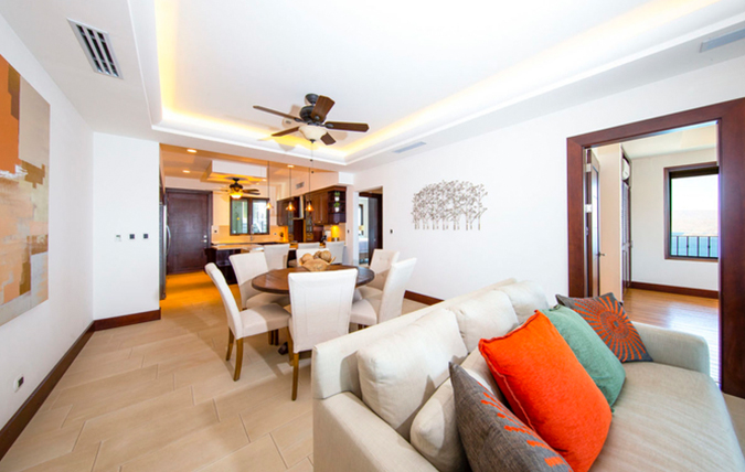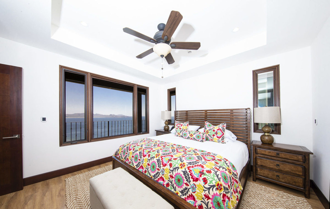 Casa Sunrise Sunset is a warm and inviting space with beautiful cabin-like decor. It features dark wood furnishings, large abstract artwork and a warm natural color pallet that creates a comfortable modern rustic ambiance. From the main living area, sliding glass doors open up to a beautiful wraparound terrace with unobstructed marina views. This Playa Flamingo vacation rental can be rented as a one bedroom, two bedroom or three bedroom.