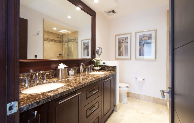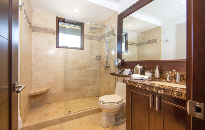 Each bedroom is equipped with a plush elevated bed, flat screen television, closet space, air conditioning and overhead adjustable lighting. Additionally, the master suite has a comfortable reading chair and direct access to the wraparound terrace. From each of the three bedrooms, walls of windows beautifully showcase the Pacific Ocean and surrounding coastline. Moreover, sliding glass doors open up to private terraces off of every room. Each bedroom also features a beautifully appointed private bathroom.