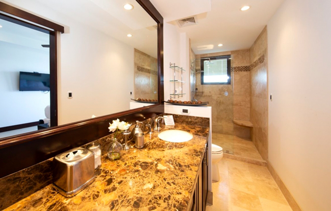 The bedroom has a plush king-sized bed, wall mounted flat screen television, ample closet space and stunning ocean views. There is a large luxury bathroom that features double vanities and a walk-in shower with double shower heads. It is a beautiful bathroom equipped with a lighted makeup mirror, hair dryer and complimentary toiletries. There is also a coffee maker, mini fridge and glassware for your convenience. With attention to the smallest of details, you are sure to enjoy this short term vacation rental in Playa Flamingo.