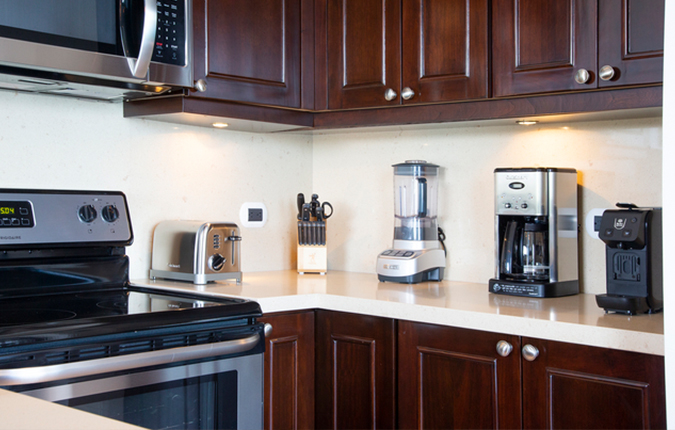This condo has stainless steel appliances including a refrigerator, dishwasher, microwave, cooktop and oven. For dining, there is a breakfast bar as well as a glass enclosed dining room and small outdoor table. Additionally, we provide tables and chairs on the rooftop terrace which can be used for enjoying a meal.