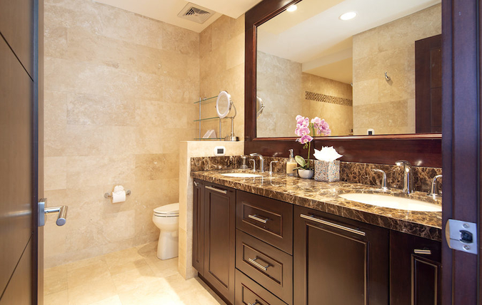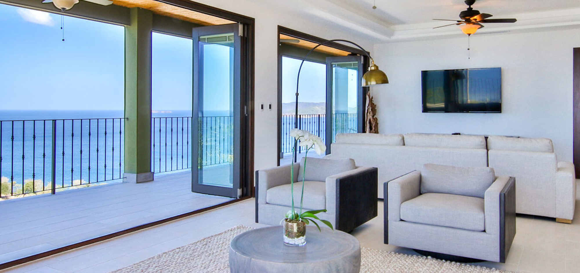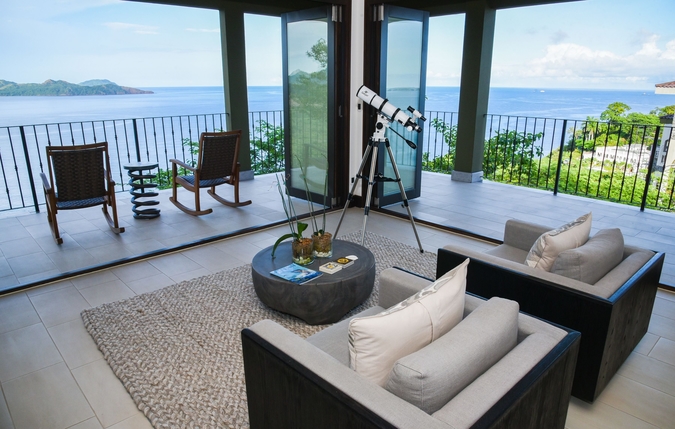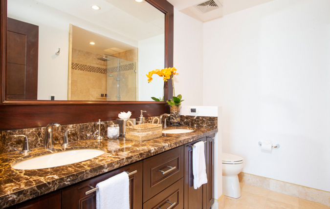 All three penthouse bedrooms showcase breathtaking coastal views through large windows. In addition to stunning views from within, every room also has direct access to a private terrace with fresh coastal breezes and impressive vistas. Each bedroom is spacious with flat screen televisions, closet space and individually controlled A/C units. All three bedrooms also have en-suite bathrooms with marble vanities, walk-in showers and complimentary toiletries. Additionally, the master bedroom features a walk-in closet and a private wrap-around balcony.