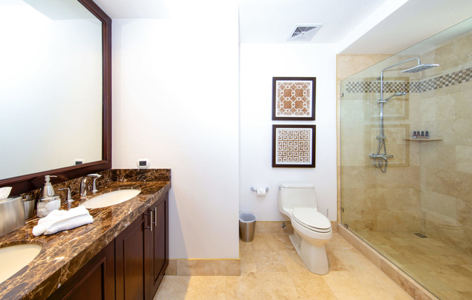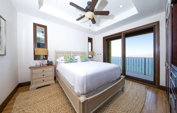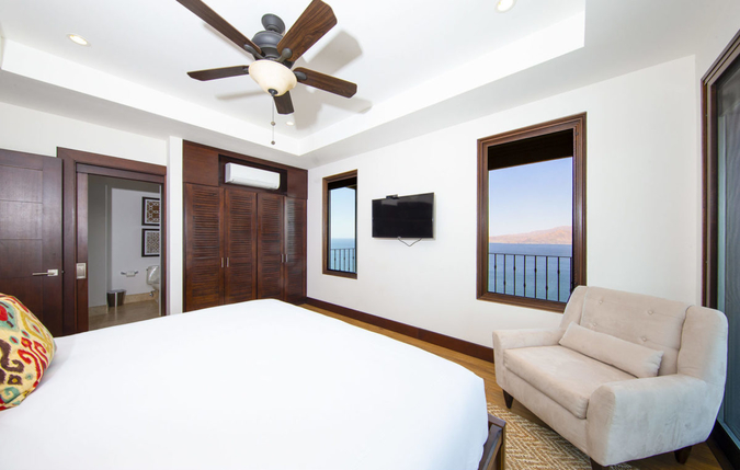 Each bedroom is equipped with a plush elevated bed, flat screen television, closet space, air conditioning and overhead adjustable lighting. Additionally, the master suite has a comfortable reading chair and direct access to the wraparound terrace. From each of the three bedrooms, walls of windows beautifully showcase the Pacific Ocean and surrounding coastline. Moreover, sliding glass doors open up to private terraces off of every room. Each bedroom also features a beautifully appointed private bathroom.