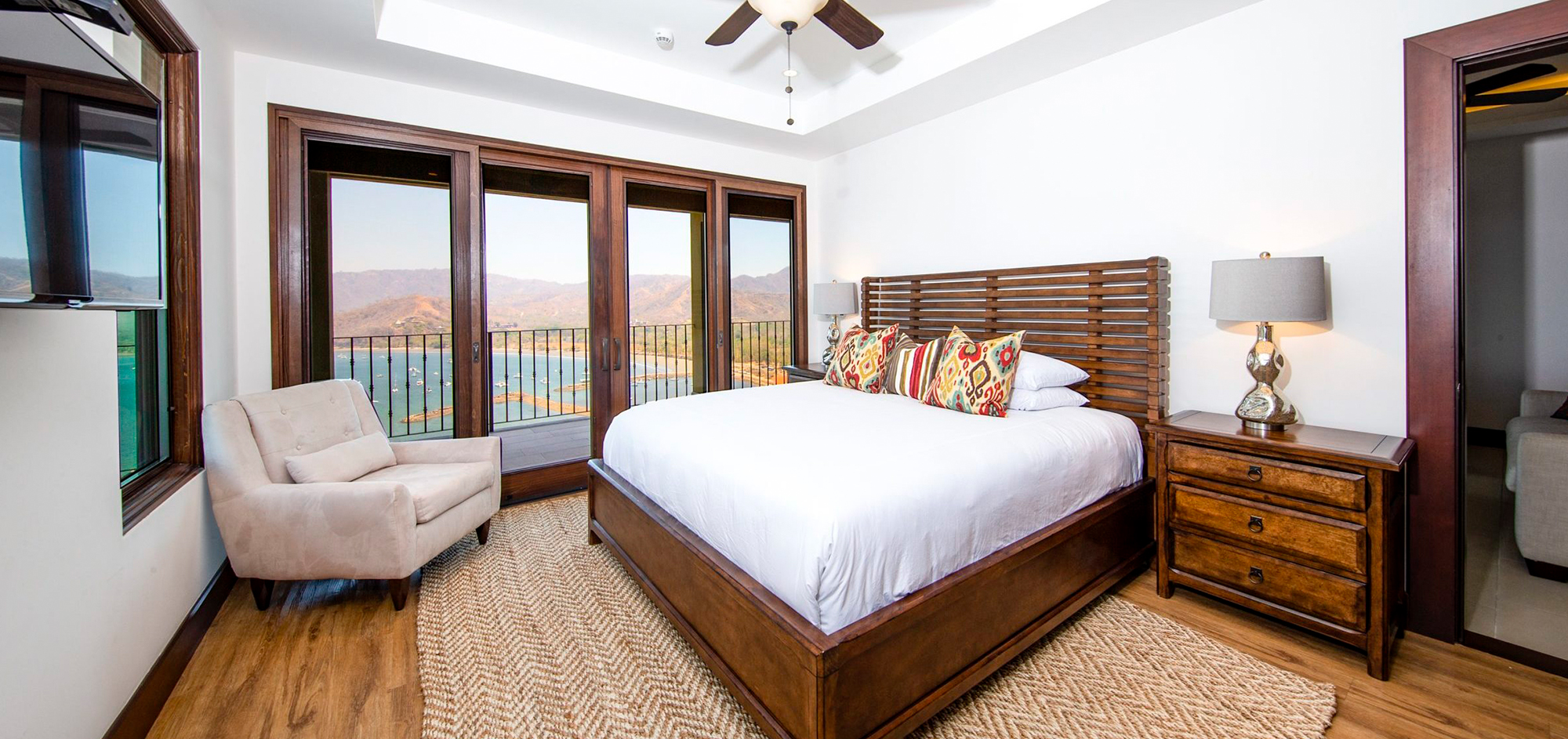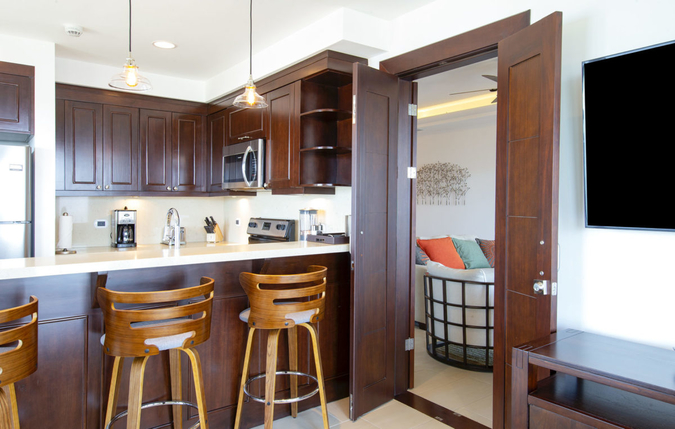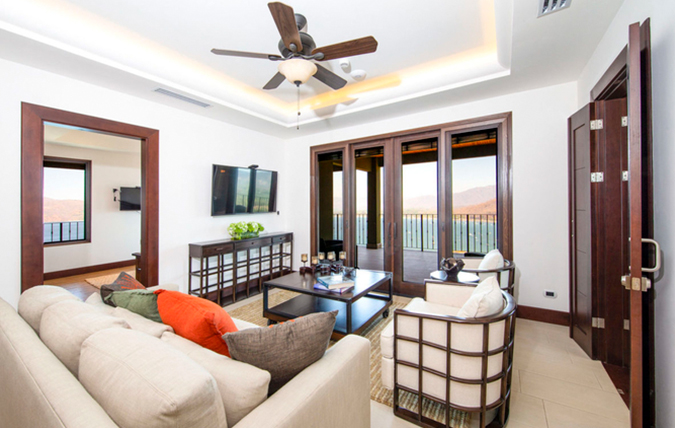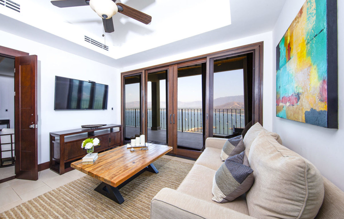 Casa Sunrise Sunset is a warm and inviting space with beautiful cabin-like decor. It features dark wood furnishings, large abstract artwork and a warm natural color pallet that creates a comfortable modern rustic ambiance. From the main living area, sliding glass doors open up to a beautiful wraparound terrace with unobstructed marina views. This Playa Flamingo vacation rental can be rented as a one bedroom, two bedroom or three bedroom.