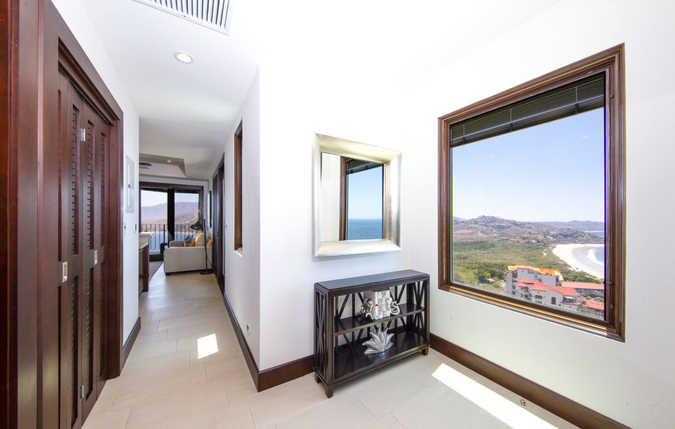 From the entryway, a large window showcases fantastic views of Playa Flamingo. Adjacent to the entrance is the main bedroom with equally as stunning views of the beach. A full bathroom and stacked washer/dryer are also both conveniently located just steps from the entrance, ideal after a day at the beach.