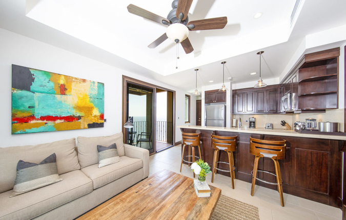 Dark wood furnishings combine with large abstract artwork and a warm natural color pallet to create a modern rustic design in this living area. From the living room you have direct access to the wraparound terrace with unobstructed views the the Marina.