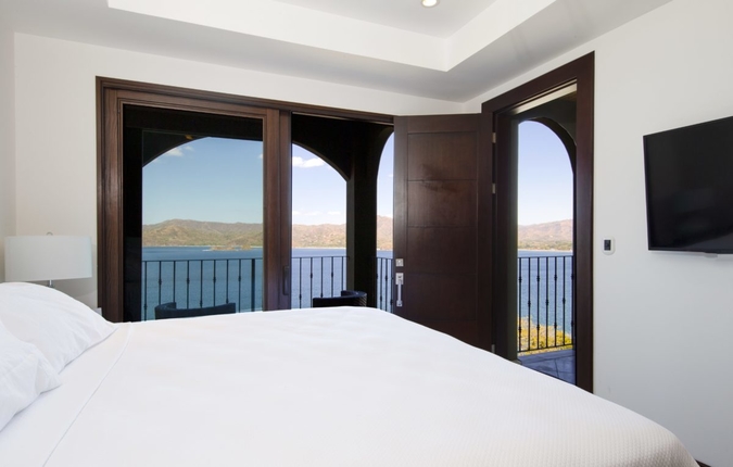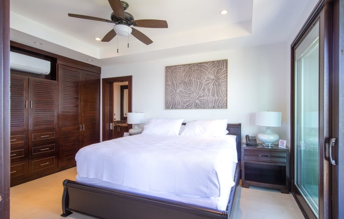 The bedroom has a plush king-sized bed, wall mounted flat screen television, ample closet space and stunning ocean views. There is a large luxury bathroom that features double vanities and a walk-in shower with double shower heads. It is a beautiful bathroom equipped with a lighted makeup mirror, hair dryer and complimentary toiletries. There is also a coffee maker, mini fridge and glassware for your convenience. With attention to the smallest of details, you are sure to enjoy this short term vacation rental in Playa Flamingo.