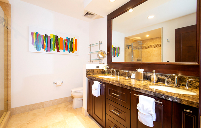 Each bedroom has a plush king-sized bed, wall mounted flat screen television, ample closet space and a large luxury bathroom. Granite topped double vanities and a walk-in shower with double shower heads and a built-in bench make for a luxuriously beautiful bathroom. With attention to the smallest of details, you are sure to enjoy your stay.
